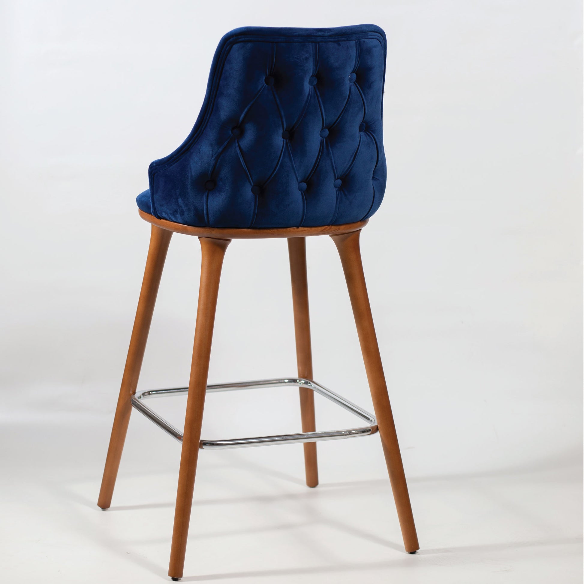 Elevate your space with this luxurious blue velvet bar chair, designed for both comfort and sophistication. The plush, tufted upholstery adds a touch of elegance, while the solid wooden legs and chrome footrest ensure durability and support. Perfect for kitchen islands, bars, or high tables, this chair combines contemporary style with timeless charm.