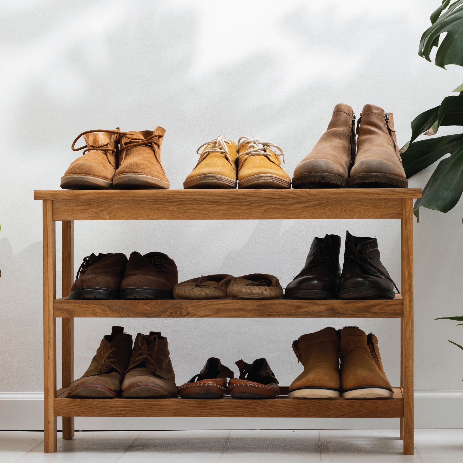 Keep your footwear neatly organized with this three-tier wooden shoe rack. Crafted from sturdy natural wood, its minimalist design fits seamlessly into entryways, closets, or mudrooms. The open-shelf structure allows for easy access and ventilation, while the warm wood tones bring a cozy, natural feel to your home décor.